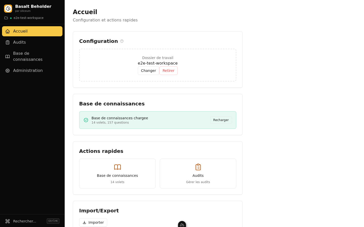 L’architecture est radicale : une PWA sans backend. Tout vit dans IndexedDB et le système de fichiers local via la File System Access API. Les bases de connaissances sont écrites en YAML, les rapports PDF sont générés côté client en réutilisant directement les composants Vue.