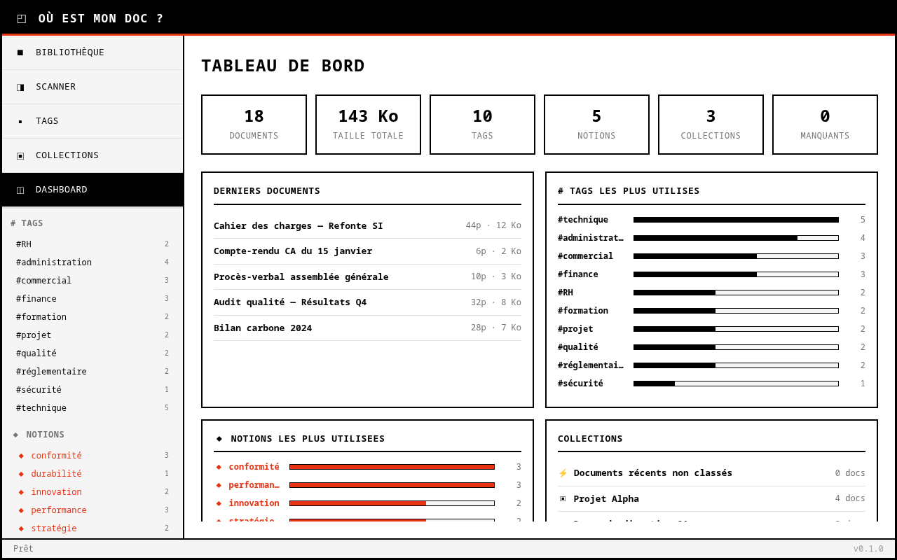 Ma soeur installe l’application sur son poste. Elle pointe le scanner vers ses dossiers de cours. L’outil parcourt récursivement l’arborescence, indexe chaque PDF, génère des miniatures en mosaïque 2x2, et propose des tags via Ollama. À partir de là, elle navigue par tags, par collections, par recherche. Un clic et le document s’ouvre.